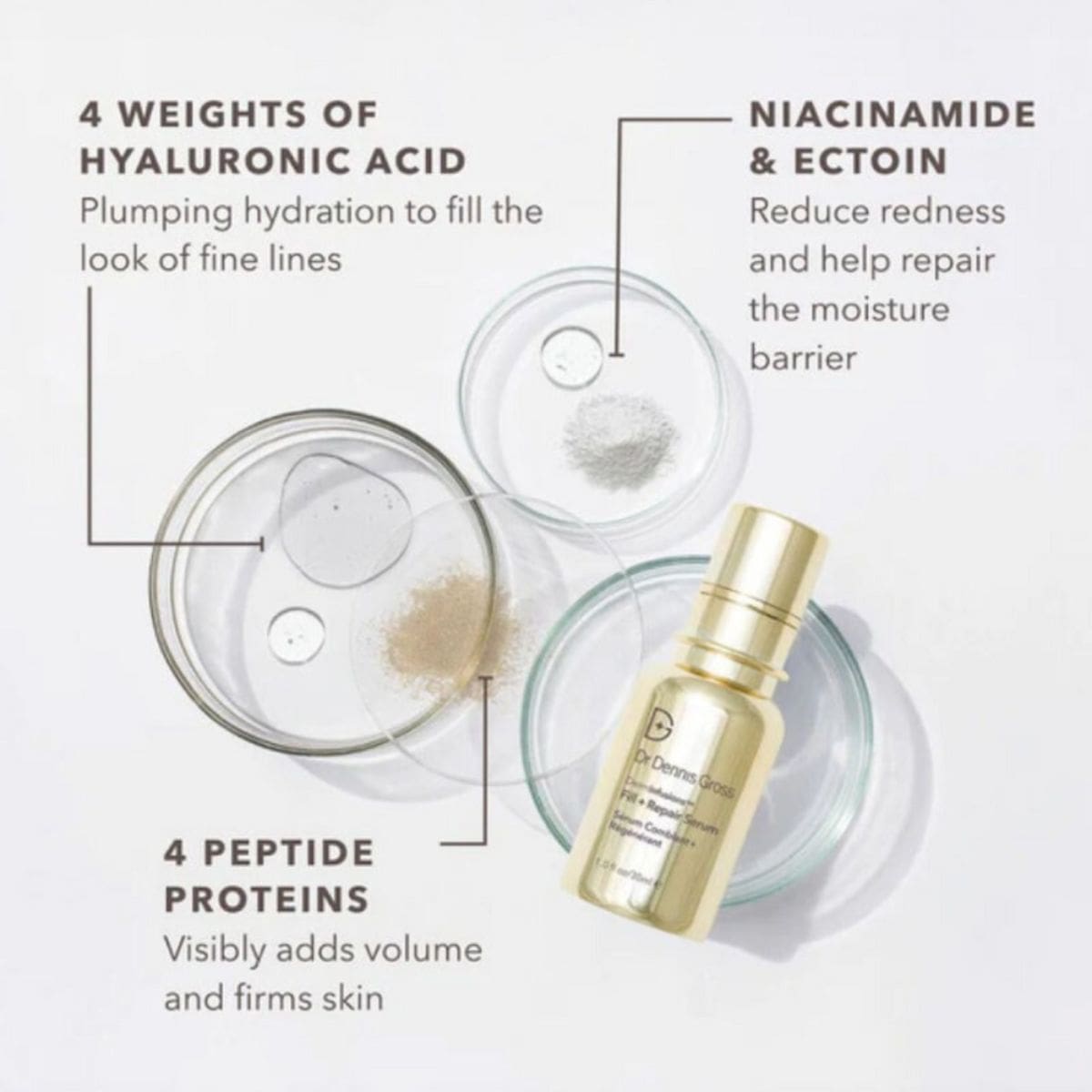Dr Dennis Gross Fill + Repair Serum er et spesialserum med unik fillereffekt. Den nøye utvalgte formelen fra Dr Gross med banebrytende ingredienser som sammen med deres patenterte Microcelle Delivery™ sluser serumet ned i huden med tredimensjonal effekt. Hyaluronsyre i ulike størrelser bidrar til intenst med fuktighet og fylde for å glatte ut linjer og rynker. Dessuten virker serumet reparerende og styrkende på hudens ulike lag ved hjelp av flere peptidkompleks, niacinamid og ektoin som gir forbedret fasthet med synlige resultater.