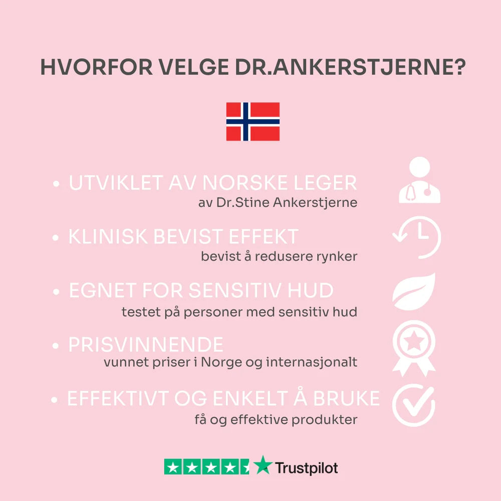 ANTI-AGE Night Cream Rich fra Dr. Stine Ankerstjerne er en næringsrik og reparerende nattkrem som styrker huden mens du sover. Kliniske studier viser at 96 % får reduksjon i rynker og 100 % får forbedret elastisitet etter kun 42 dager. Passer også perfekt som 24-timers krem for tørr eller moden hud. Den aktive anti-age-ingrediensen Gatuline® In-Tense stimulerer sammentrekning av kollagenfibre og forbedrer hudens fasthet. I tillegg bidrar hyaluronsyre til å redusere fine linjer og rynker. En sammensetning av naturlige oljer tilfører essensielle fettsyrer og vitaminer som C, B, A og E. Vegansk. Dermatologisk testet. Emballasje laget av resirkulert plast (PCR).
