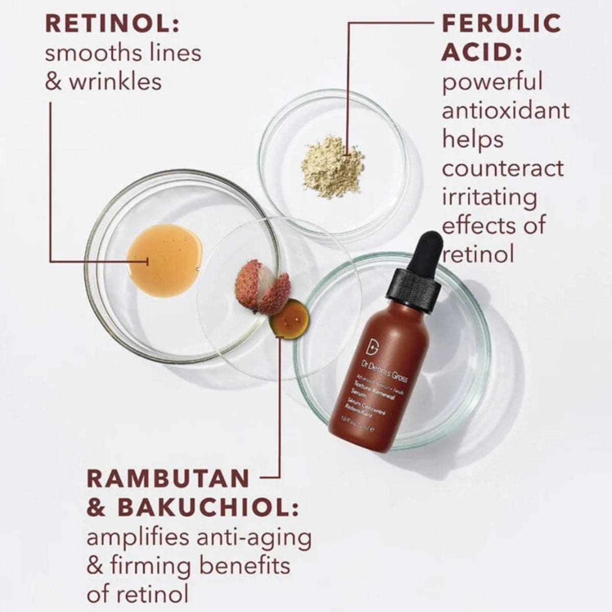Advanced Retinol + Ferulic Texture Renewal Serum er et serum som forbedrer hudstrukturen og umiddelbart gir huden nytt liv. Den minimerer og forbedrer synlig fine linjer og gir en klarere, jevnere hudtone samt motvirker fet og uren hud. Passer også som forebyggende serum for både uren hud og akne. Meget god forebyggende behandling mot hudaldring, også for de som er i 20–30-årene.