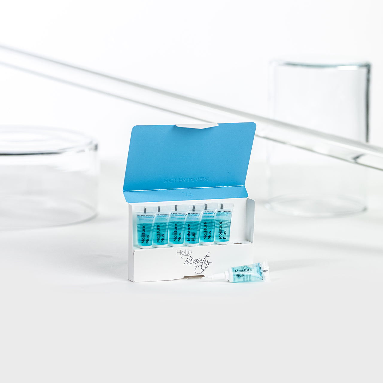Moisture Plus Ampoule fra Dr Schrammek er en 7-dagers intensiv ampulle-fuktighetskur. Gir bedre fuktbalanse og mindre tørrhetslinjer. Lavmolekylær og tverrbundet hyaluronsyre plumper huden med fukt, samtidig som fuktigheten bevares i huden over tid. Inneholder også spilantol fra planten paracess, som fungerer som «Bio-Botox» med muskelavslappende effekt som forebygger fremtreden av mimikk og tørrhetslinjer.
