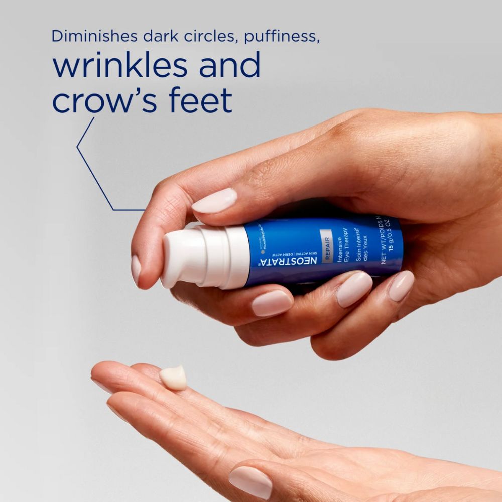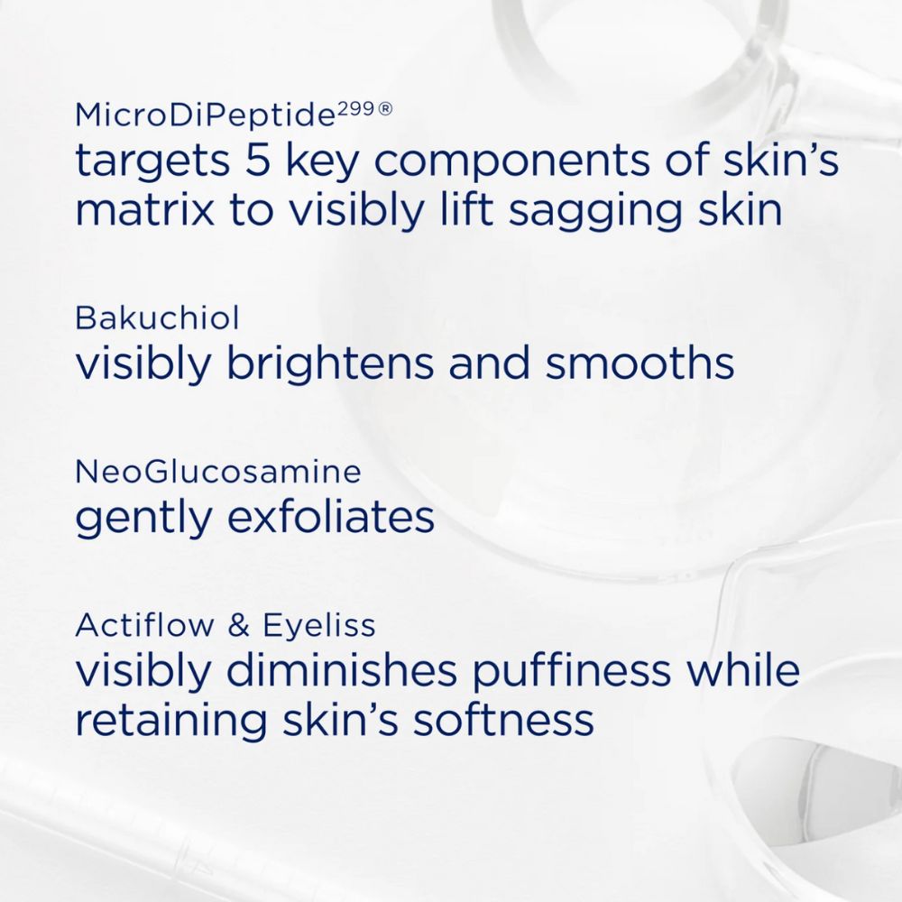 Få klarere og mer ungdommelige øyekonturer med denne allsidige formelen som korrigerer de første tegnene til aldring rundt øynene, bygger opp den sensible huden i øyekonturene og gjør dem fyldigere ved hjelp av flere ulike teknikker. Kremen inneholder stamceller fra epleekstrakt som gjør at hudens egne stamceller lever lengre, og får huden til å oppføre seg som en yngre hud. Peptider stimulerer hudens vev til å produsere mer kollagen, og sammen med patentert NeoGlukosamin styrkes kollagenets omgivende støttestruktur. Øyekonturene ser ut til å ha fått et løft, og kråketær slettes ut innenfra og ut. Koffein bidrar til å redusere poser under øynene, mens hyaluronsyre gjør huden myk og smidig. E-vitamin har antioksiderende egenskaper.