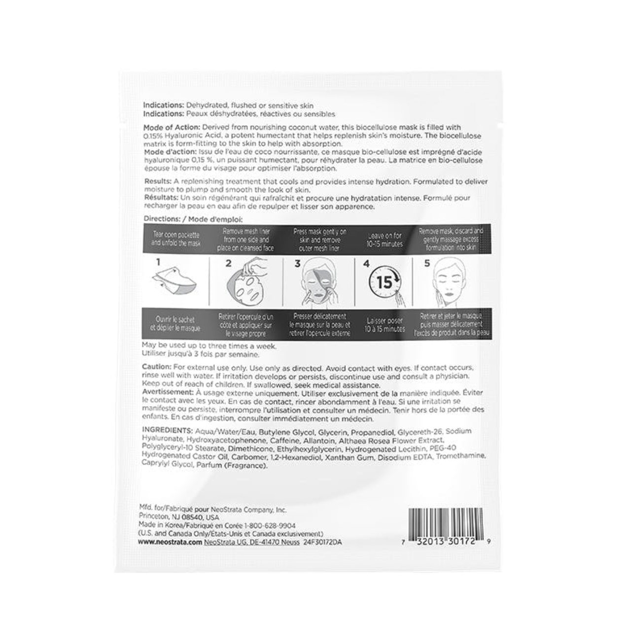 En intensivt fuktighetsgivende og oppfriskende flakmaske med hyaluronsyre og glyserin. Hyaluronsyre binder fuktighet i huden, glyserin og allantoin tilfører ytterligere fuktighet og virker mykgjørende på tørr hud, mens koffein stimulerer og vekker nytt liv i trøtt hud.