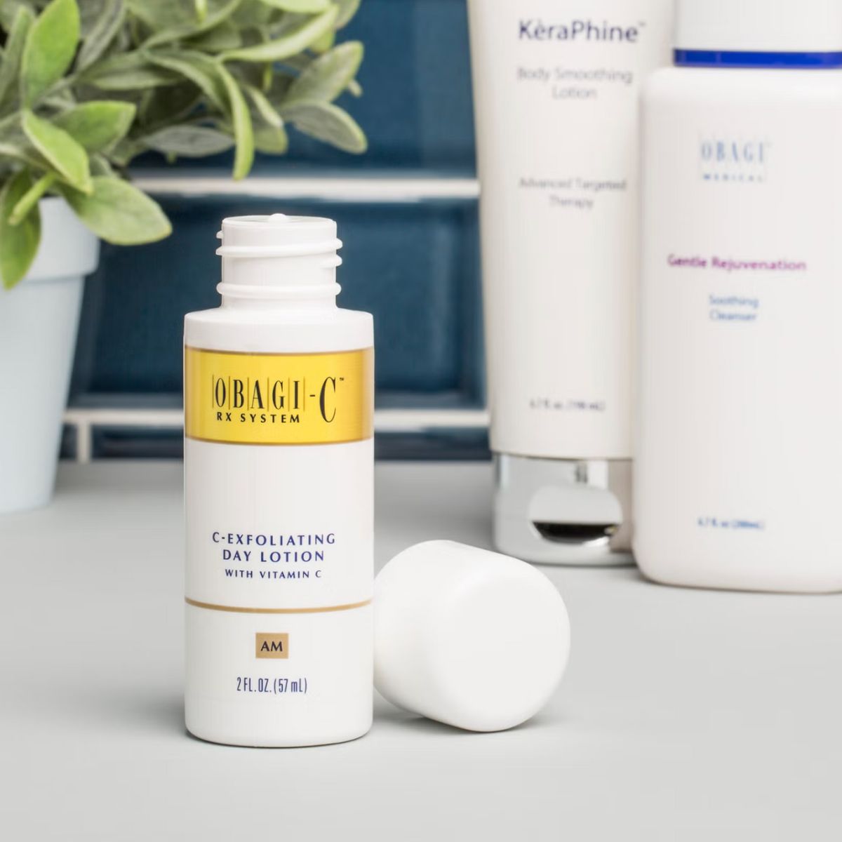 Obagi Medical C-Exfoliating Day Lotion er en lett eksfolierende dagkrem som reduserer synlige aldringstegn og gir en strålende og forynget hudtone. Glykolsyre fjerner død hud for å redusere hyperpigmentering og rynker, mens vitamin C-glukosider forbedrer kollagensyntesen for å minimere fine linjer og øke fasthet og elastisitet i huden. Den inneholder også hyaluronsyre, som hjelper til å holde fuktigheten i huden din, og kamilleekstrakt beroliger irritert og betent hud.