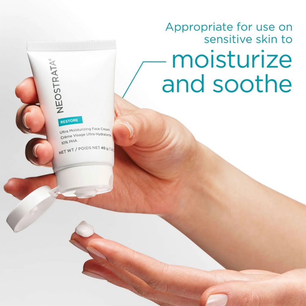 Ultra Moisturizing Face Cream er spesielt utviklet for hud som trenger ekstra omsorg, enten det skyldes klima, alder eller sensitivitet. For best mulig effekt anbefales det å starte hudpleierutinen med PHA Facial Cleanser, som fjerner urenheter og forbereder huden slik at kremen kan trenge dypere inn og virke mer effektivt. Kremen fungerer godt alene eller sammen med andre Neostrata-produkter, og bidrar til å forbedre hudens tekstur og glød over tid, samtidig som den beskytter mot ytre påkjenninger.