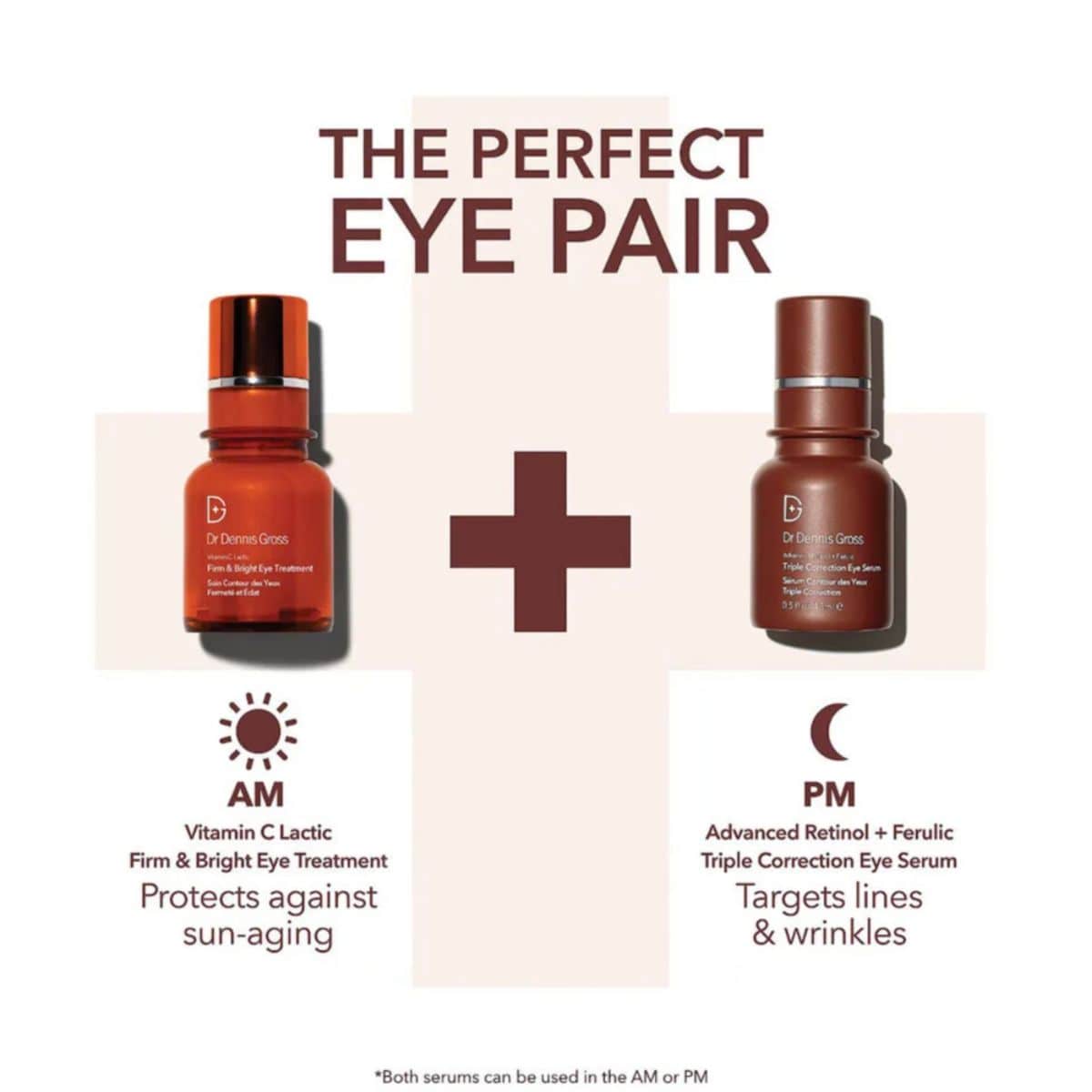 Triple Correction Eye Serum er et kraftfullt serum for øyepartiet med retinol og ferulinsyre som forebygger og minimerer utviklingen av fine linjer og rynker. Serumet gir en økt spenst og jevner ut hudtonen samtidig som den forbedrer strukturen i huden. Dette innovative øyeserumet kombinerer kraftfulle ingredienser med milde AHA-syrer for å mykne opp og glatte ut huden rundt øynene. Serumet absorberes raskt og fungerer utmerket under makeup. Den aktive, men milde formelen passer til alle hudtyper. En prisbelønnet bestselger!