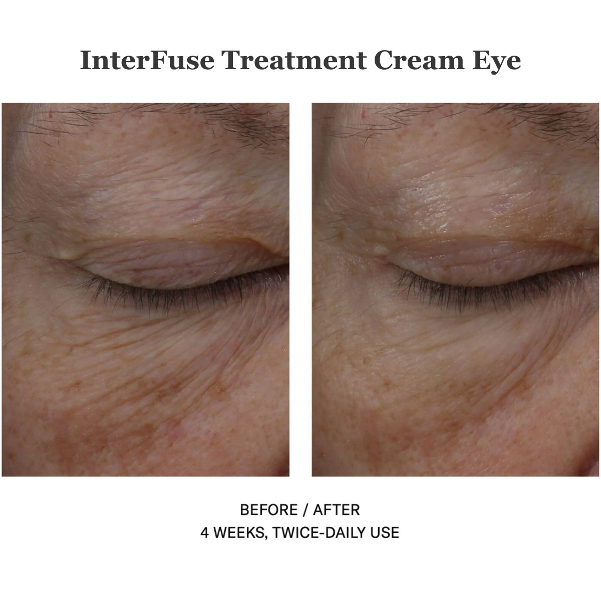InterFuse Treatment Cream EYE er en prisvinnende og avansert øyekrem spesielt formulert for å redusere synlige aldringstegn rundt øynene. Kremen kombinerer den patenterte InterFuse™-teknologien, som leverer en kraftfull cocktail av signalpeptider og aminosyrer dypt inn i huden for å stimulere kollagenproduksjonen, styrke, stramme opp og glatte ut fine linjer og rynker. Muskelavslappende peptider gir en umiddelbar glattende effekt, mens C-vitamin fra australsk kakaduplomme, verdens rikeste kilde til vitamin C, virker lysnende på huden og reduserer mørke ringer. Øyekremen inneholder også koffein som reduserer hevelser, samt niacinamid og hyaluronsyre som tilfører og låser fuktighet i huden for en frisk og balansert hud rundt øynene. Produktet passer for alle hudtyper og gir en jevnere, fastere og mer ungdommelig hudtekstur.
