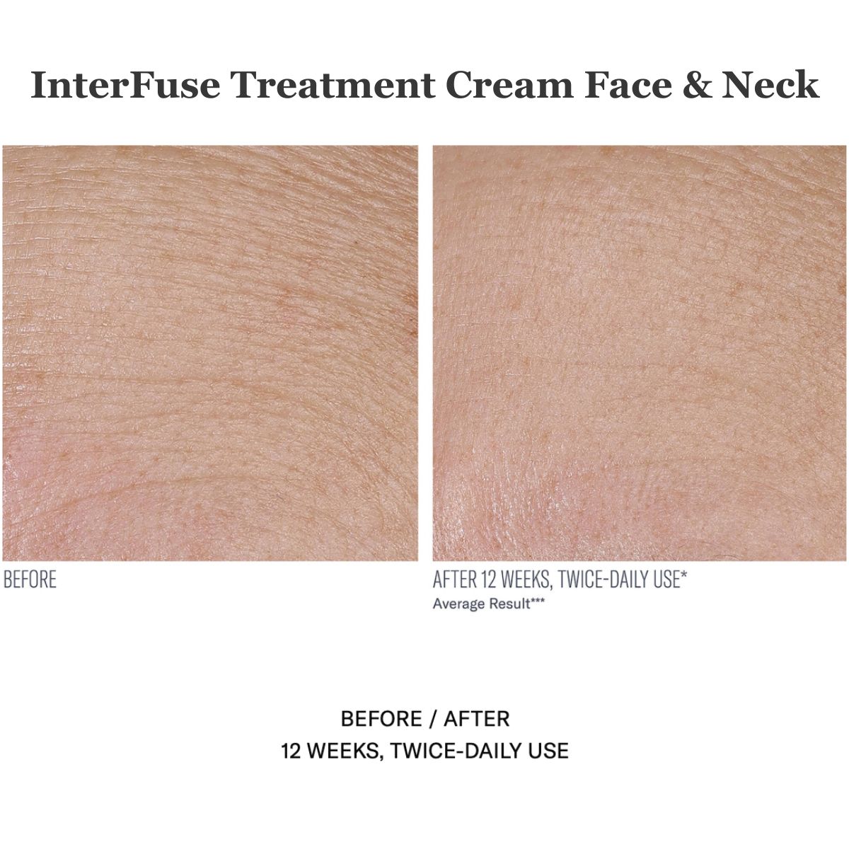 InterFuse Treatment Cream FACE & NECK er en avansert dagkrem som bruker den patenterte InterFuse™-teknologien for å stimulere produksjonen av fem ulike typer kollagen og elastin i huden. Dette gjør huden fastere, glattere og reduserer synligheten av fine linjer og rynker. Kremen inneholder signalpeptider, nerveavslappende peptider som gir umiddelbar glattende effekt, og kraftige polyfenoler fra oliventrær ved Middelhavet som beskytter mot oksidering og nedbryting av kollagen. Sheasmør og glyserin gir huden et pustende, fuktgivende lag.