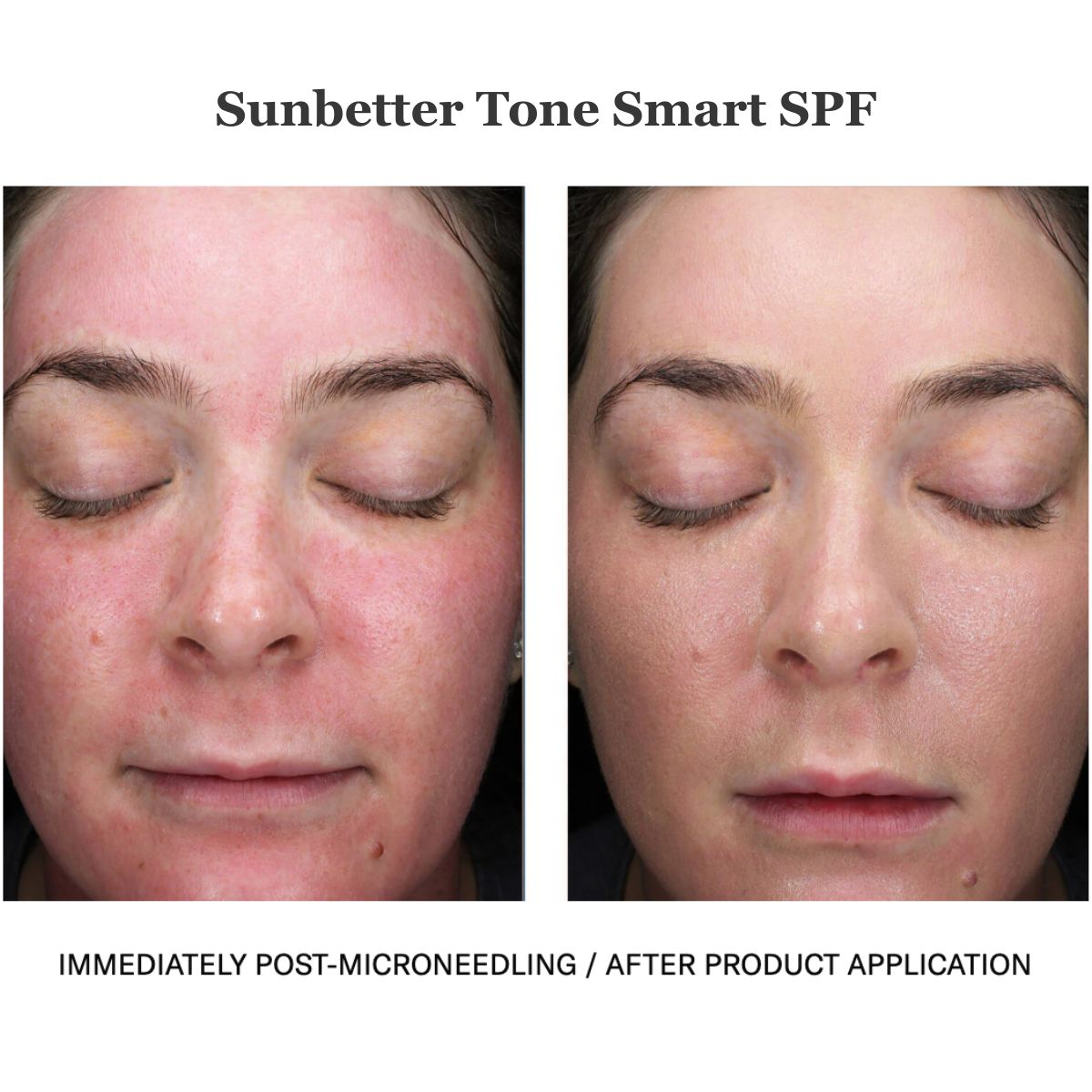 Tone Smart SPF50+ Sunscreen Compact er en 100% mineralbasert solbeskyttelse i en elegant kompakt som tilpasser seg hudtonen og gir et lett farget hint. Produktet inneholder 8,4% titaniumdioksid og 10% sinkoksid, som gir bredspektret UVA- og UVB-beskyttelse med en høy SPF 50+. Formelen har en optisk mykgjørende og utjevnende effekt som reduserer synlighet av linjer, rynker og uregelmessigheter. Den er vannresistent i opptil 80 minutter og gir effektiv beskyttelse mot sol, infrarødt lys, blått lys og forurensning. Den er spesielt egnet for sensitiv hud og etter hudbehandlinger. Produktet gir en jevn og naturlig finish og kan brukes som siste steg i hudpleierutinen før makeup.