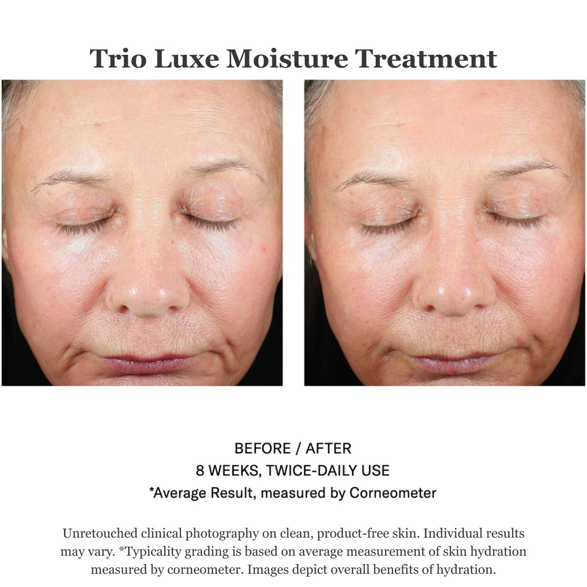 Trio Luxe Moisture Treatment 50ml fra Skinbetter Science er en ultrarik, fløyelsmyk fuktighetskrem utviklet for å gi intens og langvarig fukt til tørr og dehydrert hud. Kremen gir liv til en gusten hud, styrker hudbarrieren og bidrar til å redusere synlig rødhet, samtidig som den forbedrer hudteksturen og gir et sunnere, mer balansert utseende. Trio Luxe har en nærende sammensetning med nøkkelingredienser som urea-kompleks, ceramider, kolesterol, squalane, glycin, salicornia herbacea-ekstrakt, niacinamid og olivenfruktekstrakt. Den triple-action-formelen sikrer dyp fukt og hjelper huden å holde på fuktigheten, noe som gjør den ideell for moderat til svært tørr hud, spesielt i kalde, tørre perioder. Huden blir umiddelbart mykere, mer komfortabel og får ny glød.