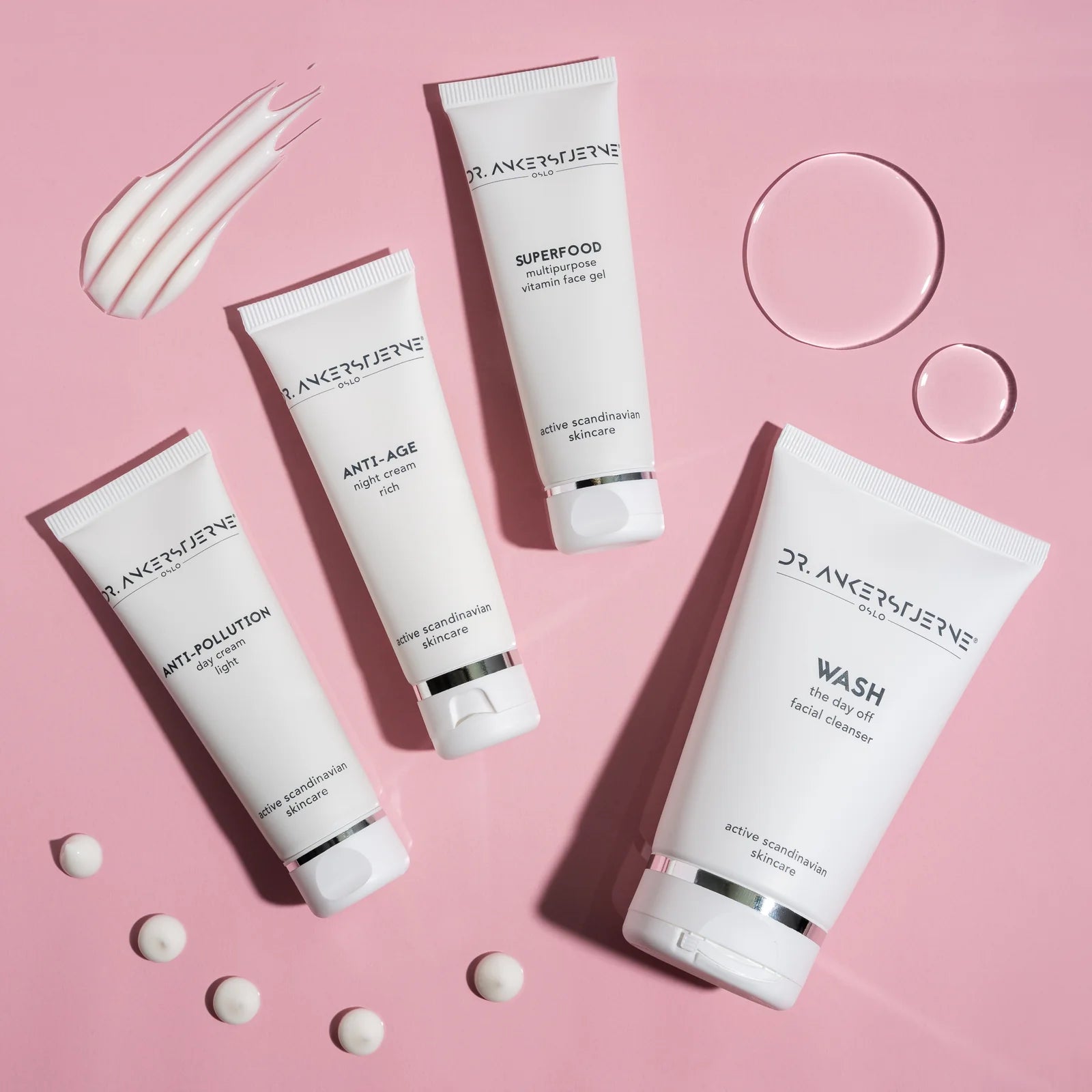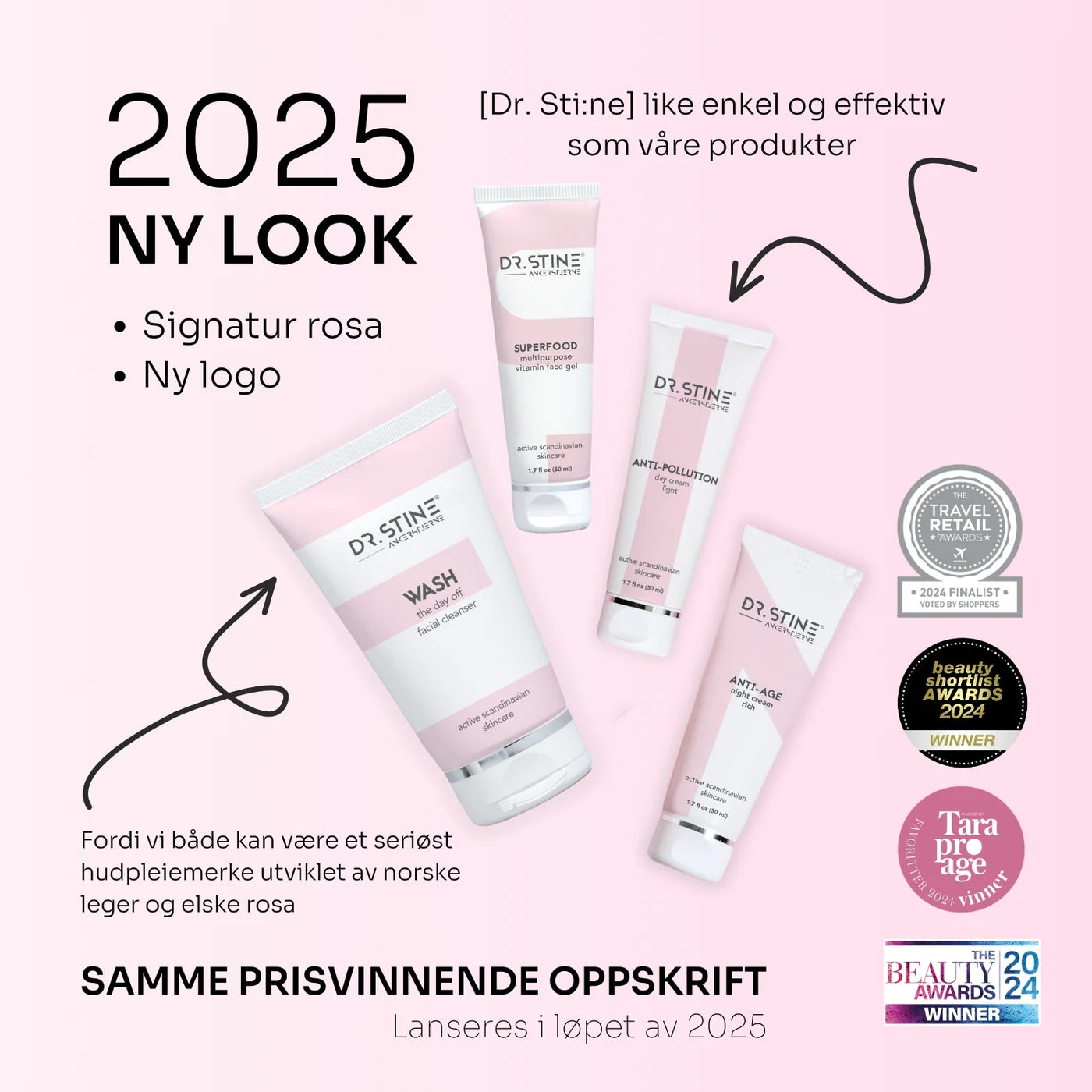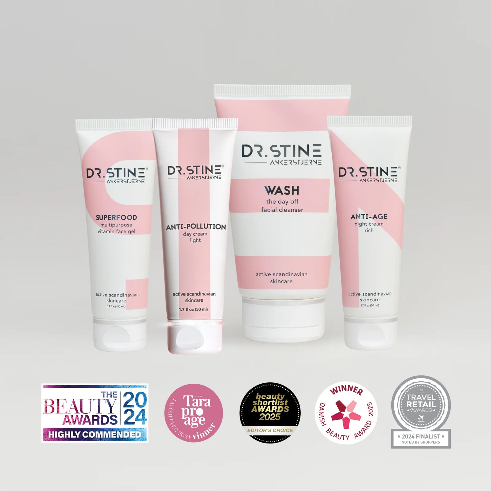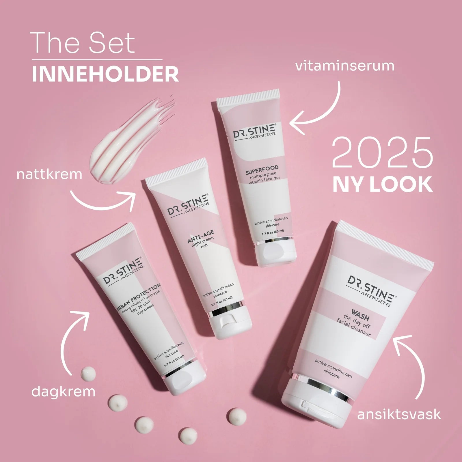 Inspirert av skandinavisk enkelhet og utviklet med medisinsk presisjon, tilbyr Dr.Stine en klinisk dokumentert 24-timers hudpleierutine i fire enkle steg. Settet inneholder fire multifunksjonelle produkter – serum, dagkrem, nattkrem og rens – med hele 20 aktive ingredienser som virker i synergi for å gi deg sunn, sterk og glødende hud. Resultatene er dokumentert: færre rynker, bedre elastisitet og forbedret hudtekstur på kun 6 uker.