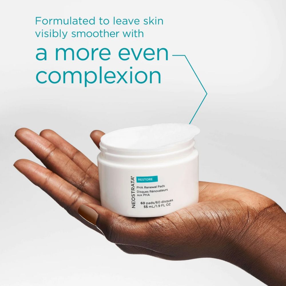 NeoStrata PHA Renewal Pads er skånsomme eksfolieringspads utviklet for daglig bruk, og passer perfekt for deg som ønsker jevnere hud, mer glød og bedre fuktbalanse uten å irritere huden. Padsene gir en mild, men effektiv eksfoliering som hjelper med å fjerne døde hudceller, forbedre hudens klarhet og motvirke tørr, gusten og livløs hud. Formelen er utviklet for høy toleranse og kan derfor brukes av alle hudtyper – også sensitiv og reaktiv hud.